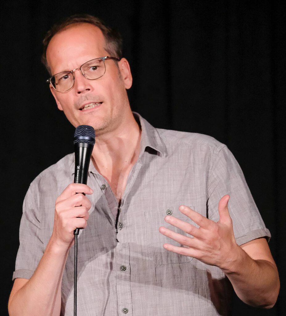 Bei seiner Comedy im Stehen schreckt er auch vor einer Gitarre als komisches Druckmittel nicht zurück. Sei es mit eigenen Songs oder Melodien, sie man kennt – aber seine saulustigen neue Texte dazu eben nicht.